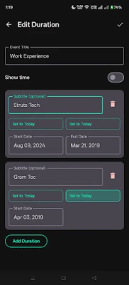 Key Features: Create and manage duration groups with multiple events Set custom start and end dates/times with 12/24-hour format support "Set to Today" feature for quick current date selection Automatic duration calculations Organized display with upcoming events section Edit and delete functionality Local data storage - no internet required Perfect for tracking