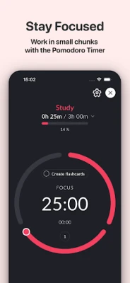 Use the customizable pomodoro timer to break work into manageable intervals, enhancing your focus and efficiency. You can customize: