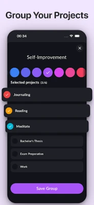 Organize projects into groups like "Work," "Study," or "Personal" to keep your focus sharp and manage time effectively.