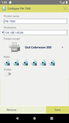 Enter the IP address or hostname of the printer > Give it a name > Check or define the printer model > Define the number of rolls > Indicate if there is a folder > Add / Save > Ready!